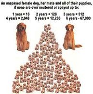 An unspayed female dog, her mate and all of their puppies, if none are ever neutered or spayed.....can produce in 6 years = 67,000 dogs!
